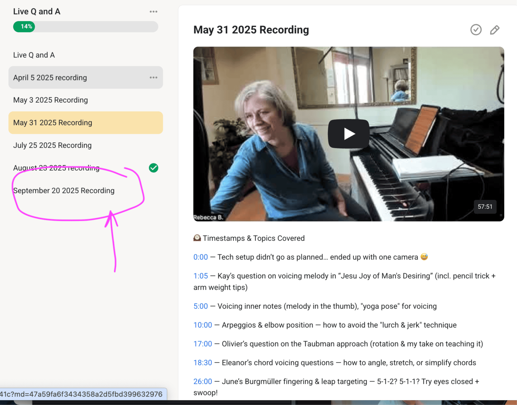 | Hi Reader, Rolled chords shouldn’t feel like yoga. I just posted a new 3-minute clip from a live Q&A inside Piano with Rebecca B. showing the body setup that stops stretching and makes your chords ring clean. You’ll hear the before/after and think, there it is. If you’re not a member yet, this is exactly what you get inside Piano with Rebecca B: a time-stamped, indexed library of Q&As you can jump through like a cheat code. And bring your exact question to the next monthly Q&A. Already a member? I’m sending this so you don’t miss it. Log in and cue it fast: Classroom → Live Q&A → Sept. 20 Recording. I'll answer every question you post in the community feed. Free trial ends tomorrow, Saturday at 8 a.m. PDT. After that, doors close and we’re back to waitlist only. Prefer one-on-one? First lesson is 50% off: Talk soon, Rebecca Listen to me on Spotify: https://open.spotify.com/album/5G3ykFGmxVjYTAeQT85a7y |